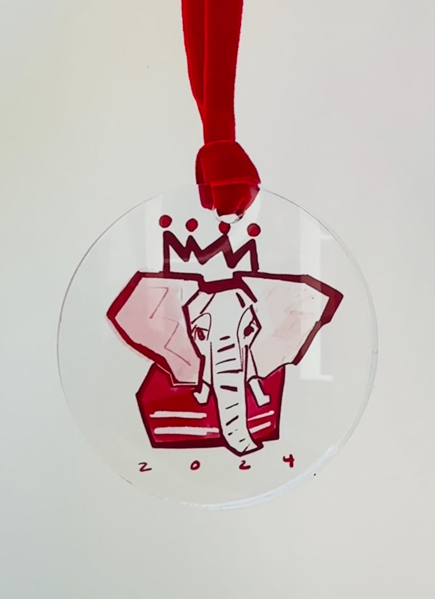 Celebrate the season with our exclusive 2024 holiday ornament. Each acrylic disc features our best-selling crimson crowned elephant design and adorned with a red velvet ribbon. This ornament is perfect for: