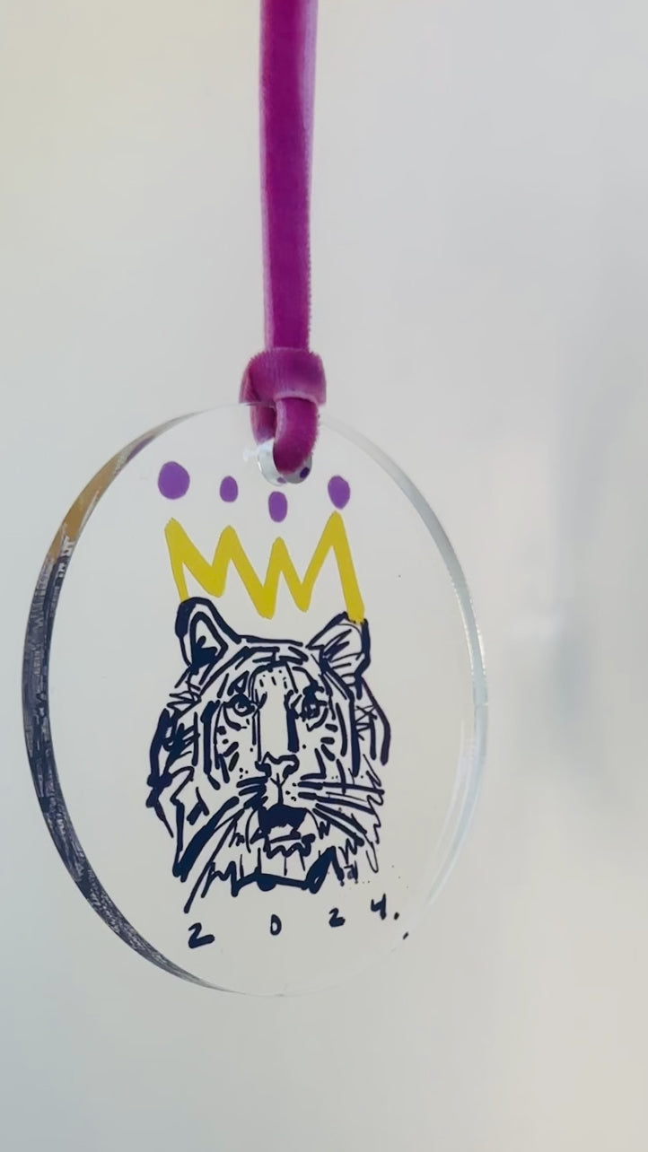 Celebrate the season with our exclusive 2024 holiday ornament. Each acrylic disc features our crowned purple and gold tiger adorned with a lilac velvet ribbon. This ornament is perfect for: